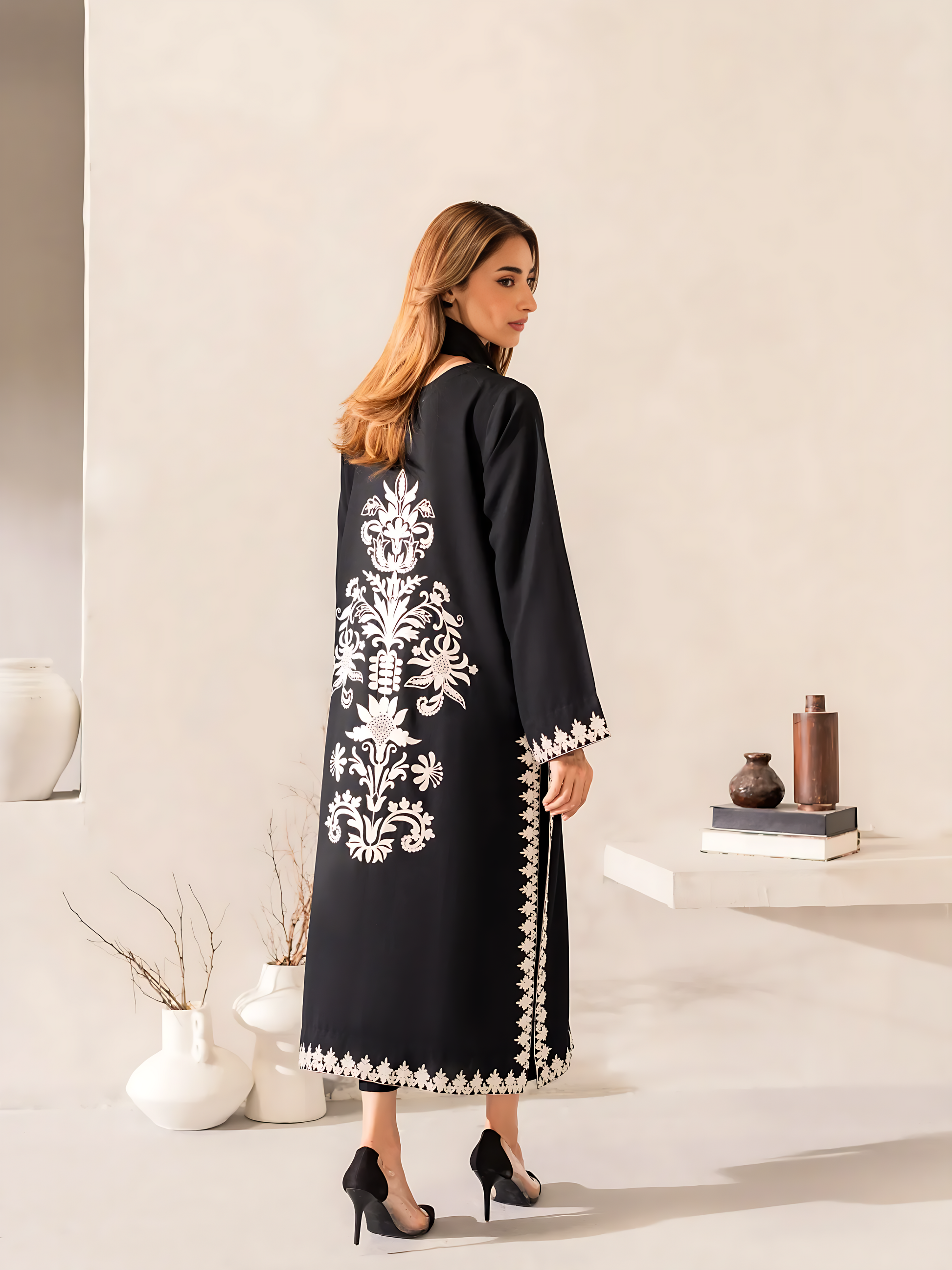 🌟 Design: Elegant white thread embroidery on back, sleeves & borders